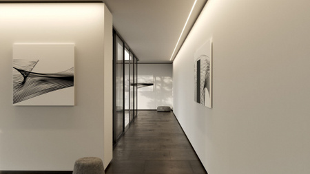 Efekt końcowy montażu profilu PLATO z kloszem DOUBLE wpuszczonego pomiędzy płytami, przymocowanego przy zastosowaniu wkrętów a następnie pokrytego gładzią szpachlową
